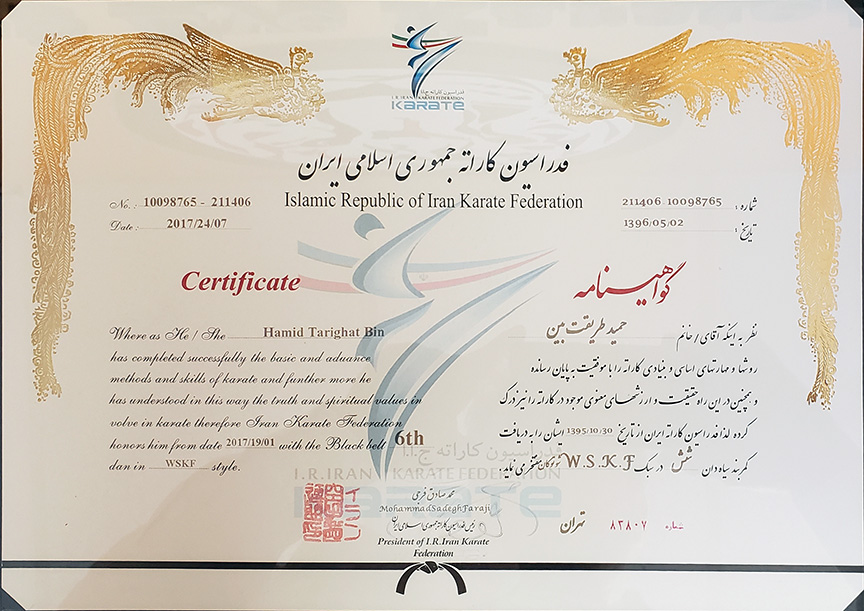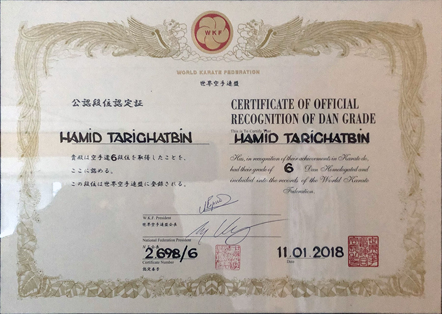 • 6th Dan (degree) black belt from world Karate Federation (WKF)