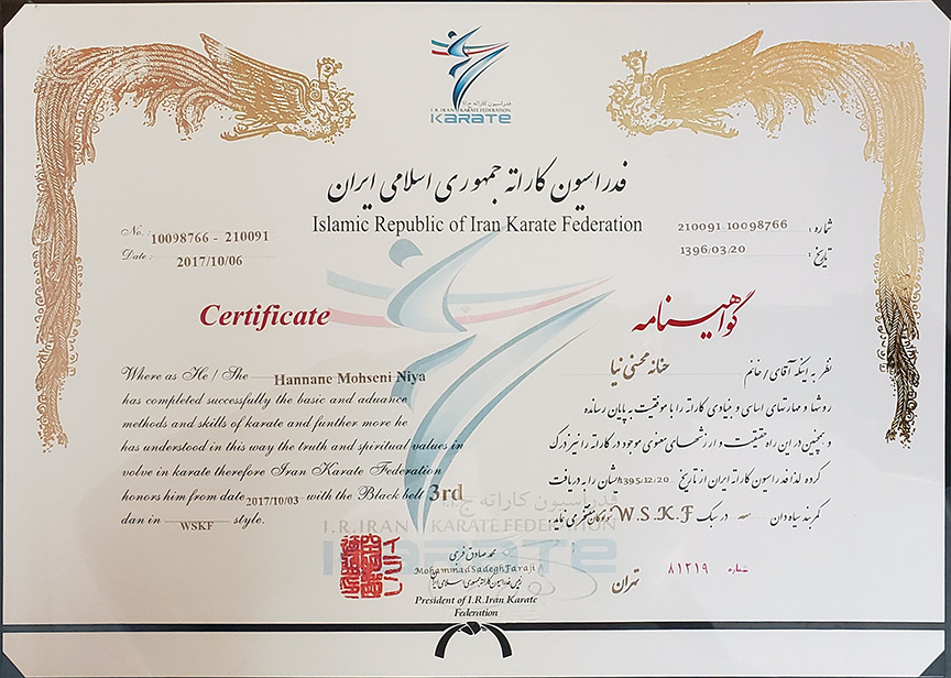 • 4th Dan (degree) black belt from Shotokan karate international federation (Hirokazu Kanazawa SKIF)