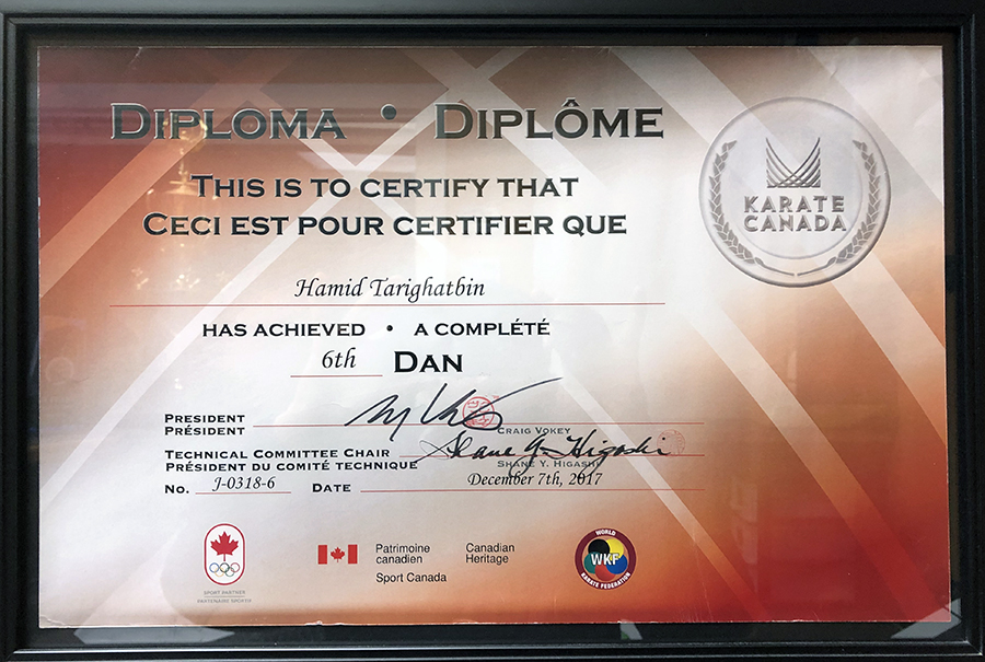 • 6th Dan (degree) black belt from Karate Canada Federation (KCF)